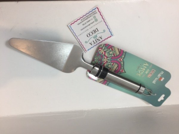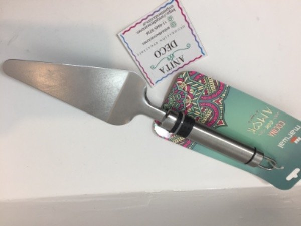 Pala espátula de torta, de forma triangular, de acero inoxidable.